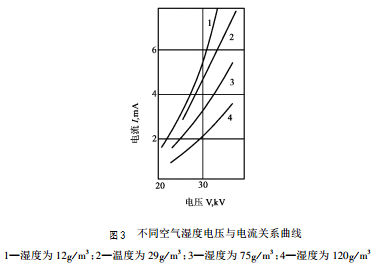 空氣濕度也是影響電暈放電的因素,在相同的電壓下,空氣濕度越大,電流越小,這主要是濕度增加,空氣分子不易為電子所電離之故。不同空氣濕度時,電壓與電流的關系曲線如下圖3所示。